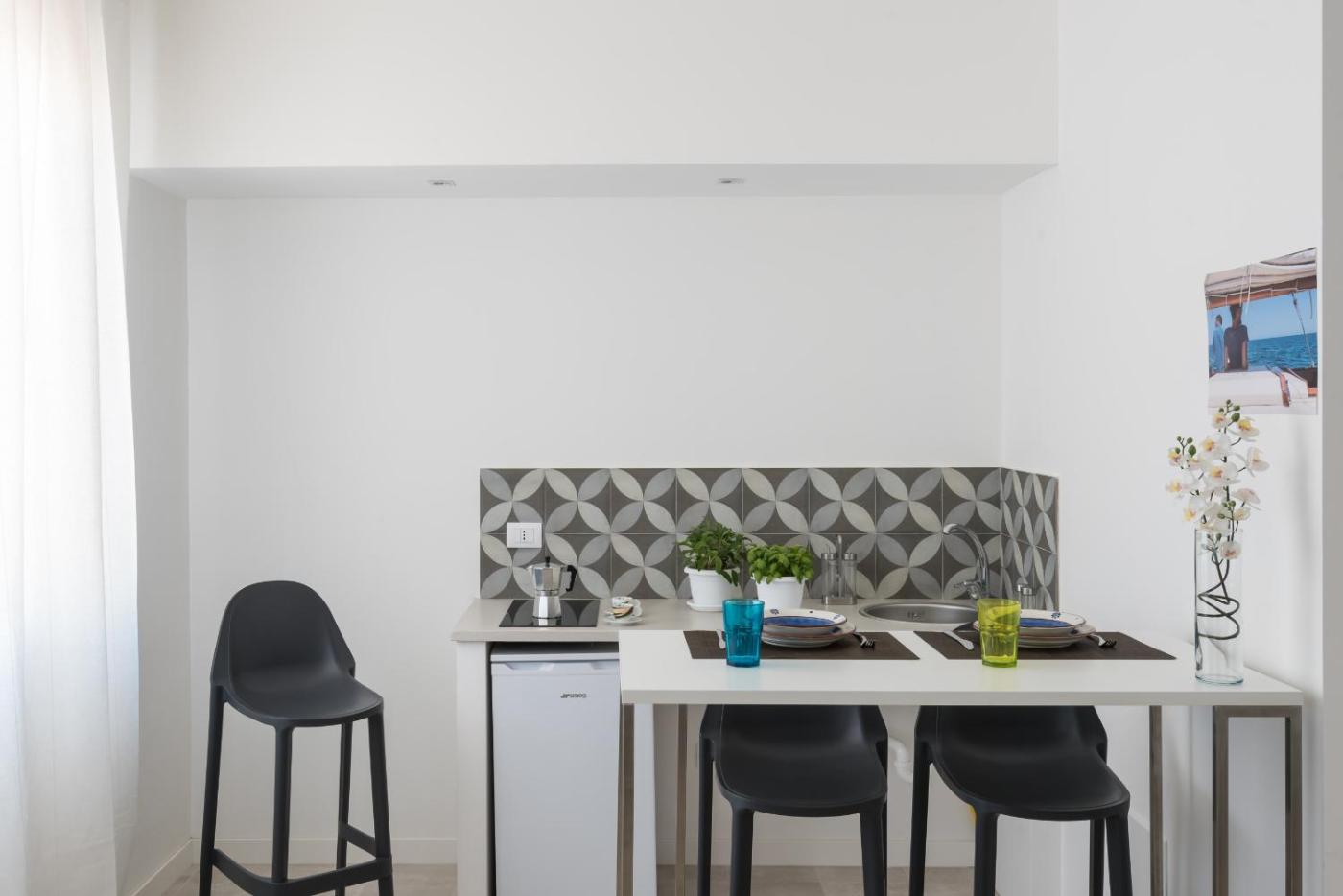 Superior Studio. Providing free toiletries, this studio includes a private bathroom with a shower, a bidet and a hairdryer. Guests can make meals in the kitchen that is equipped with a stovetop, a refrigerator, kitchenware and a microwave. The air-conditioned studio provides a TV, a tea and coffee maker, a seating area, a dining area as well as sea views. The unit offers 1 bed. ;